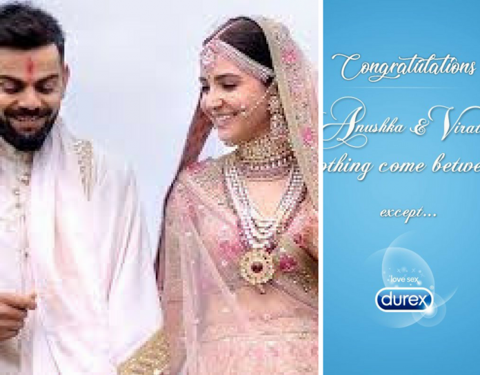 जी हां कंडोम कंपनी ड्यूरेक्स ने लिखा है कि विराट और अनुष्का आपको शादी की शुभकामनाएं आप दोनों के बीच में कोई ना आए सिवाय ड्यूरेक्स के